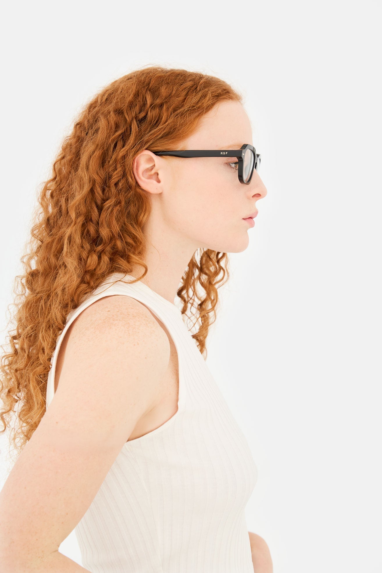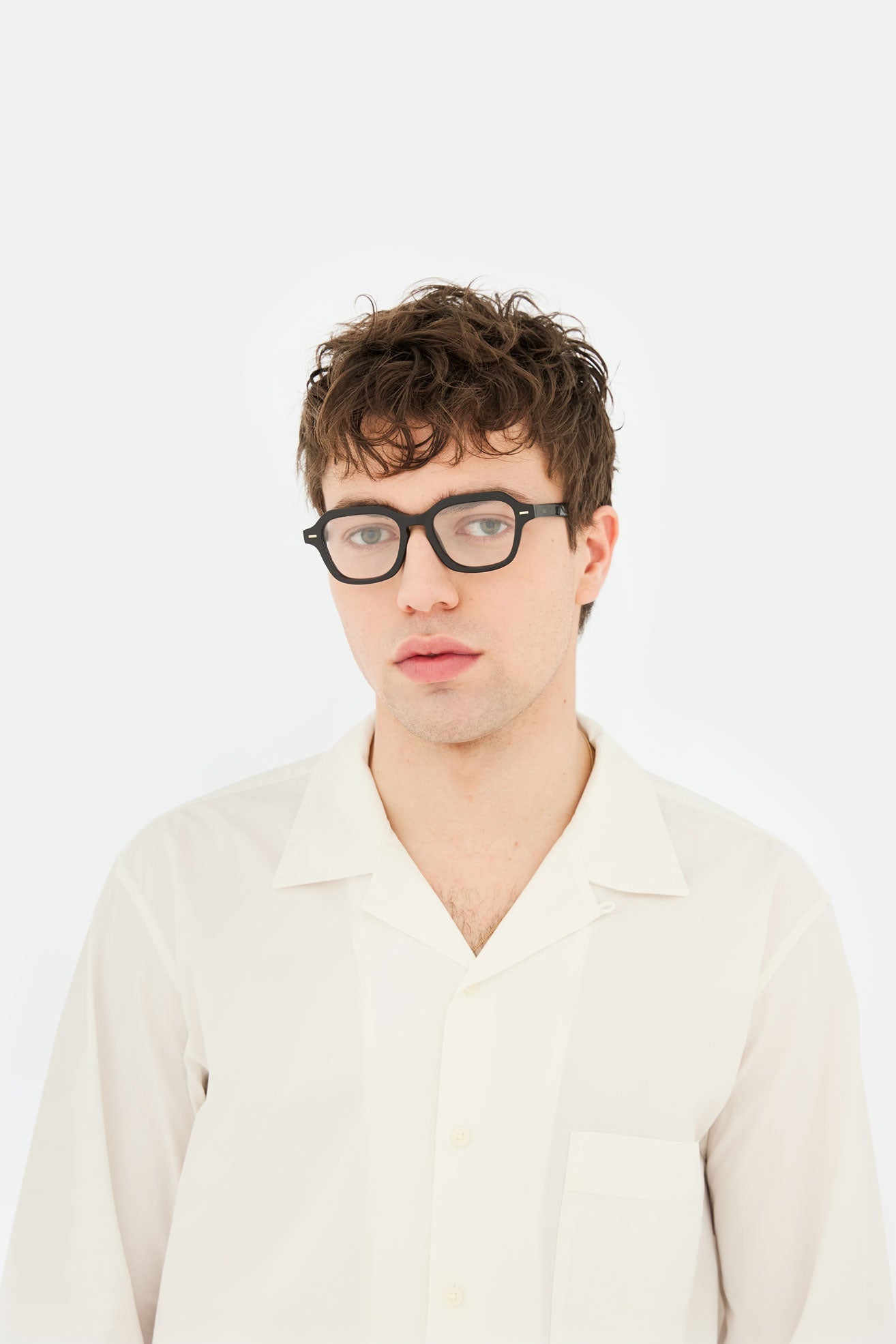 Acetato italiano de alta calidad en un clásico acetato negro. Lentes transparentes de pantalla en la base 4. Lentes graduadas no incluidas. Gafas premium diseñadas en Milán, Italia.