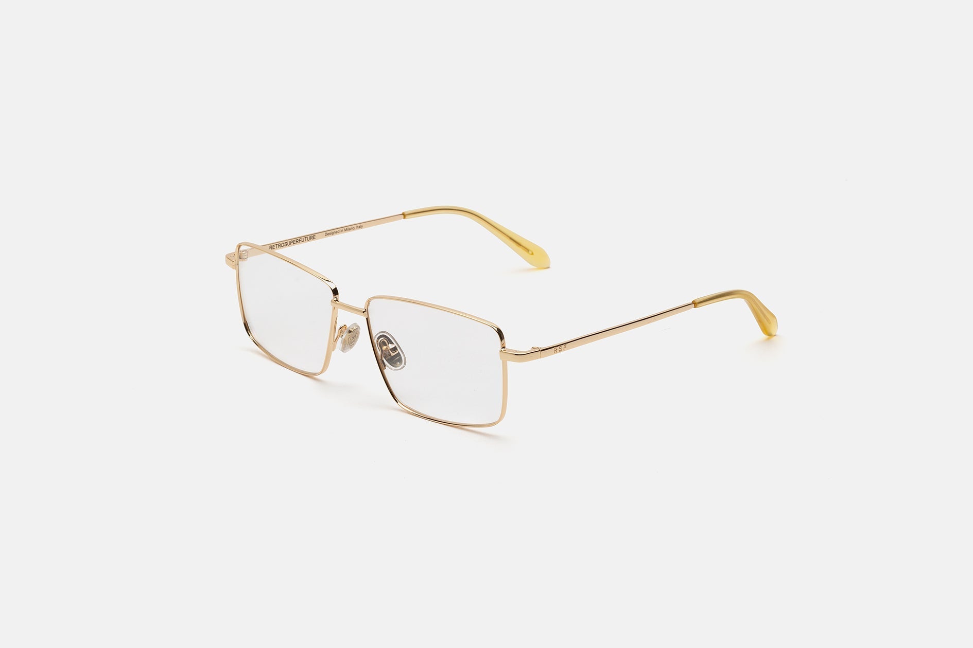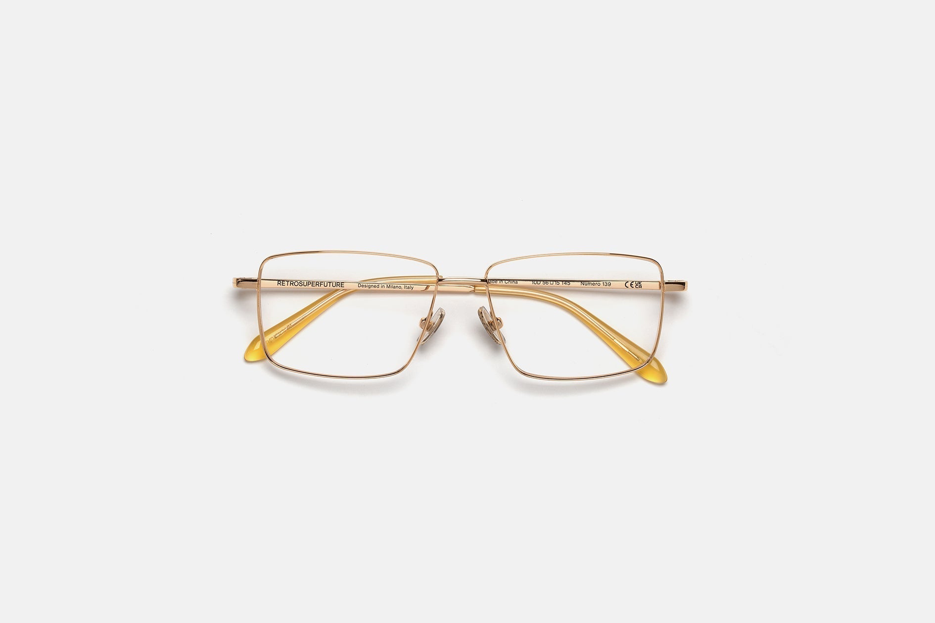 Metal de alta calidad con acabado galvánico dorado brillante y punta de acetato para un ajuste cómodo. Lentes transparentes en la base 4. Lentes graduadas no incluidas. Gafas premium diseñadas en Milán, Italia.