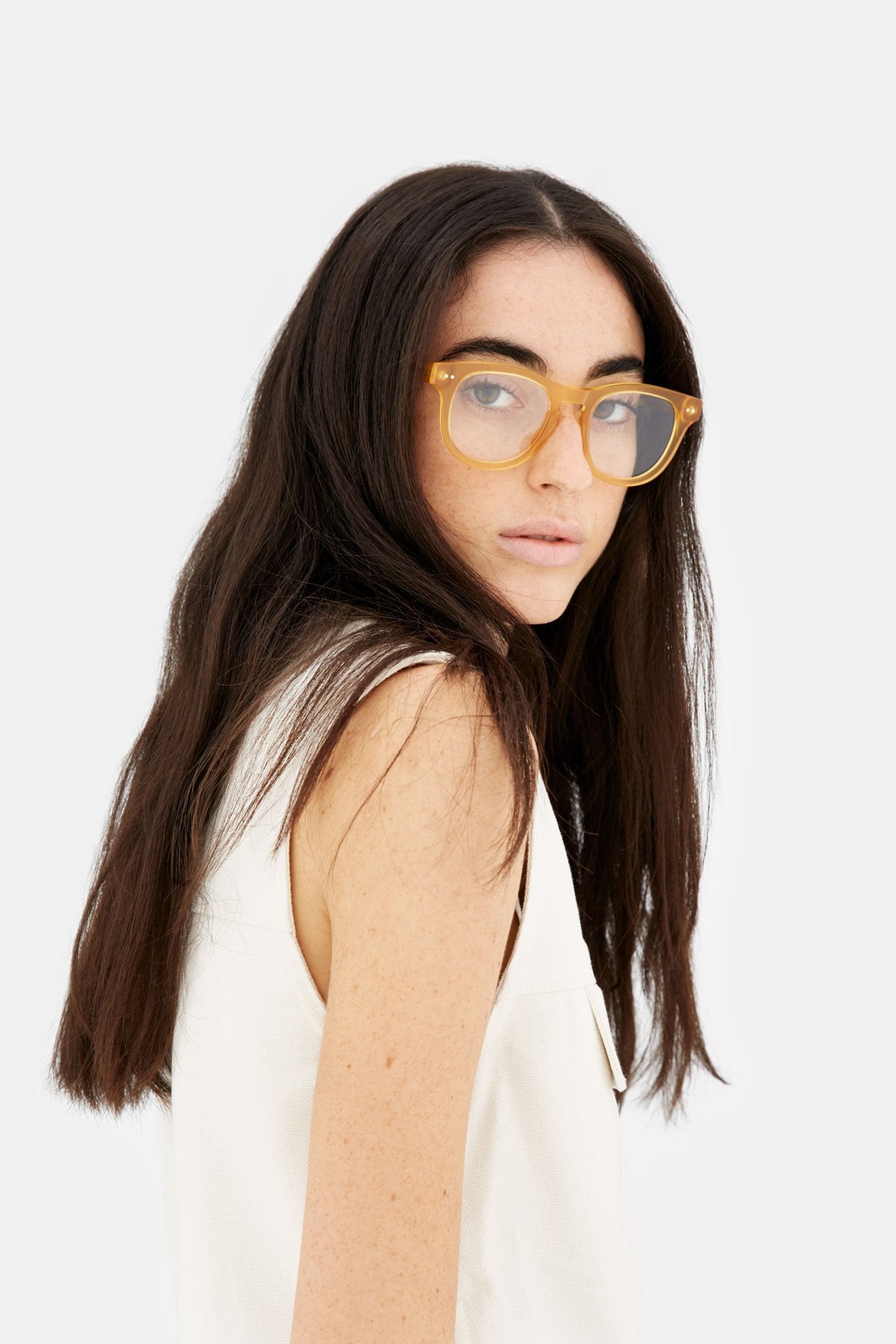 Curvas precisas y detalles funcionales definen esta atrevida montura, con bordes gruesos, una línea superior curva y un puente nasal con forma de ojo de cerradura para el uso diario. Este modelo viene con un acetato tipo cristal teñido de ámbar. Lentes con graduación no incluidos.